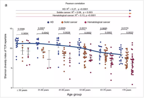 不過巔峰后也將面臨下滑,之前有大家分享過德國馬丁路德大學曾利用NGS測序技術研究了來自健康和癌癥患者的346份血液樣本,獲得了大約880萬份TCR數據集合。研究團隊發現:伴隨年齡的增長,即使是健康個體,T細胞多樣性也會不斷下降。