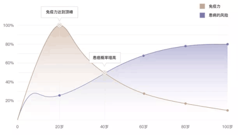 T細胞作為免疫細胞的“主力軍”之一,當其多樣性下降,我們的免疫系統已經無法像以前一樣機敏,對每一種病毒及腫瘤細胞進行及時的識別與清除,尤其是40歲前后,我們會迎來T細胞多樣性的“滑坡”: