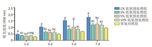同樣,唐建宏等也探究了不同體積分數氧氣預處理人羊膜間充質干細胞后對其生物學特性影響。將第3代人羊膜間充質干細胞通過不同體積分數氧氣進行預處理48 h,隨機分為1%,3%,5%,10% 低氧預處理組和常氧對照組(體積分數21%氧氣),并檢測細胞增殖能力。發現,低氧預處理能提高人羊膜間充質干細胞的增殖能力,且體積分數1%氧氣預處理效果優于體積分數3%,5%,10%,21%氧氣預處理。