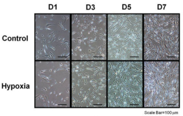 Shun-Pei Hung等人為了探究低氧對骨髓間充質干細胞的作用,將細胞在常氧(21% O2)和低氧(1% O2)狀態下培養不同時間(1、3、5、7天)。研究結果表明,與常氧組相比,在低氧狀態下培養的細胞,細胞增殖能力顯著提高。