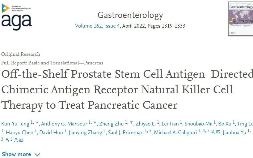 2022年1月6日,一項發表在國際腸胃病領域權威雜志《Gastroenterology》的創新性研究顯示,CAR-NK療法能夠顯著抑制胰腺癌,并且極有可能在不久的將來攻克胰腺癌。
