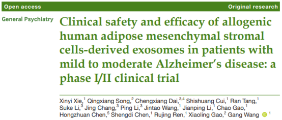 上海交通大學醫學院附屬瑞金醫院王剛教授團隊完成并發布采用間充質干細胞來源的外泌體噴鼻治療阿爾茨海默病的國際首個臨床試驗(Clinical Trial NCT04388982),該研究成果發表于General Psychiatry。該臨床試驗證明了人脂肪衍生的間充質干細胞外泌體ahaMSC-Exos的安全性,所有受試者可耐受一周兩次的鼻內給藥,同時為進一步臨床試驗提供了劑量選擇和參考依據。