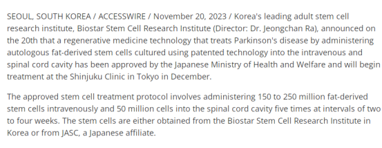 根據外媒報道,韓國一成體干細胞研究機構表示,利用專利技術培養的自體脂肪干細胞治療帕金森病的再生醫學技術已獲得日本厚生勞動省批準,將于12月在東京新宿診所開始治療。