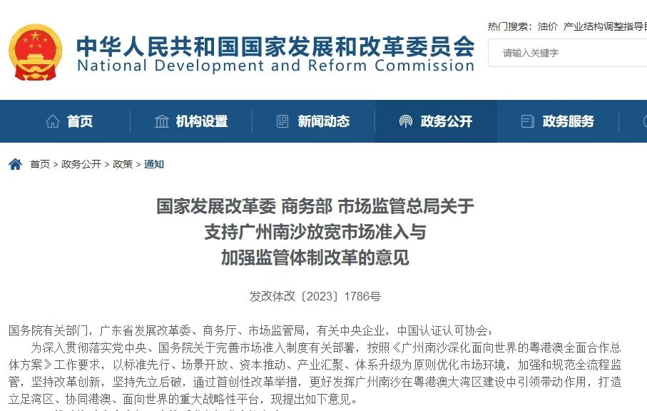 2024年1月9日,為深入貫徹落實黨中央、國務院關于完善市場準入制度有關部署,按照《廣州南沙深化面向世界的粵港澳全面合作總體方案》工作要求,國家發展改革委、商務部、市場監督總局發布發布《關于支持廣州南沙放寬市場準入與加強監管體制改革的意見》文件。通過首創性改革舉措,更好發揮廣州南沙在粵港澳大灣區建設中引領帶動作用,打造立足灣區、協同港澳、面向世界的重大戰略性平臺。