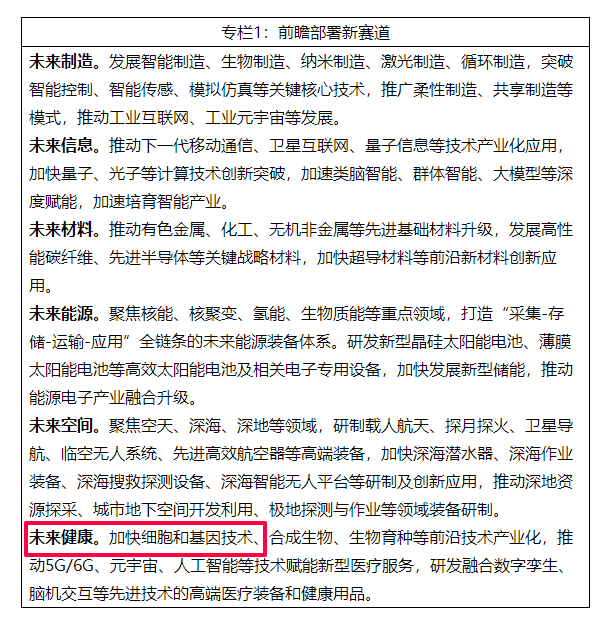 工業和信息化部、教育部、科技部等七部門聯合印發《關于推動未來產業創新發展的實施意見》,文件中提到重點推進未來制造、未來信息、未來材料、未來能源、未來空間和未來健康六大方向產業發展。其中,“加快細胞和基因技術產業化”被列為未來健康產業重點!