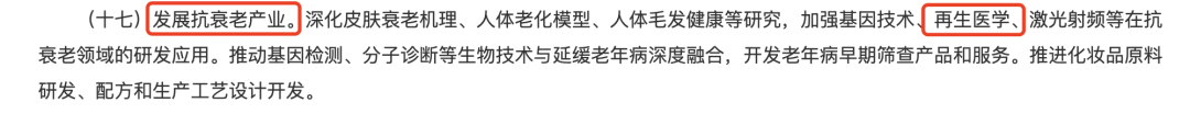 國務院辦公廳印發《關于發展銀發經濟增進老年人福祉的意見》,這是國家出臺的首個支持銀發經濟發展的專門文件。文件中,發展抗衰老產業及再生醫學再次被點名,強調深化高精尖技術在抗衰老領域的研發應用,推動生物技術與延緩老年病深度融合,開發老年病早期篩查產品和服務。