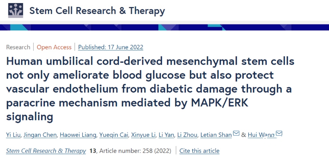 2022年6月17日,該雜志(影響因子:6.832)刊載的另一則研究證實[1]:間充質干細胞(MSCs)不但能降低血糖,還可以通過MAPK/ERK信號介導的旁分泌機制保護血管內皮免受糖尿病損傷。在治療糖尿病血管并發癥上有著巨大潛力。