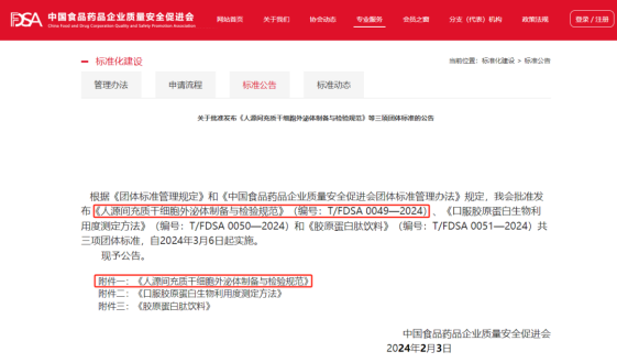 近日,中國食品藥品企業(yè)質(zhì)量安全促進會發(fā)布公告,《人源間充質(zhì)干細胞外泌體制備與檢驗規(guī)范》(編號:T/FDSA 0049—2024)批準發(fā)布,將于2024年3月6日起實施,這一規(guī)范的建立和發(fā)布,填補了國內(nèi)在該領(lǐng)域標準化方面的空白,為人源間充質(zhì)干細胞外泌體的研究和應(yīng)用提供了必要的技術(shù)規(guī)范和參考。