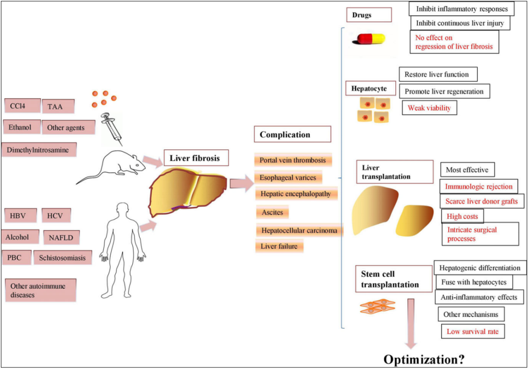 對(duì)于肝硬化失代償期患者的治療,主要是針對(duì)病因的藥物、抗肝纖維化藥物及補(bǔ)充白蛋白、利尿、內(nèi)鏡硬化或套扎、血液凈化(人工肝)和血管介入等對(duì)癥治療。這些治療雖然可以有效延緩患者疾病的進(jìn)展,但無(wú)法完全逆轉(zhuǎn)所有患者的肝臟功能減退。目前,肝移植仍然是治療失代償肝硬化最有效的手段。但由于供體肝臟來(lái)源缺乏,只有少數(shù)患者能得到移植治療,遠(yuǎn)不能滿足失代償期肝硬化治療的臨床需求。