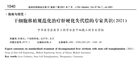 2014年,我國(guó)中華醫(yī)學(xué)會(huì)醫(yī)學(xué)工程學(xué)會(huì)干細(xì)胞工程學(xué)組發(fā)布了我國(guó)首個(gè)干細(xì)胞移植規(guī)劃化治療失代償期肝硬化的專家共識(shí)。2021年,華醫(yī)學(xué)會(huì)醫(yī)學(xué)工程學(xué)分會(huì)干細(xì)胞工程學(xué)組再次發(fā)布了《干細(xì)胞移植規(guī)范化治療肝硬化失代償?shù)膶<夜沧R(shí)(2021)》。