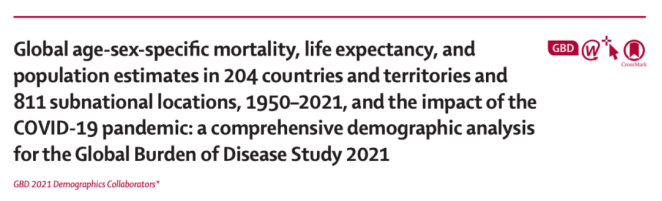 全球范圍內的全死因死亡率在1950-2021年之間呈現出兩種不同模式:年齡標準化死亡率在1950-2019年間下降(下降了62.8%),而在2020-2021年的COVID-19大流行期間上升(上升了5.1%)。1950-2021年期間,全球人口的預期壽命增加了22.7年,從49.0歲增加到了71.7歲。而在大流行的2019-2021年間,全球人口的預期壽命下降了1.6年,逆轉了1950年以來的歷史趨勢。在204個國家和地區中,僅有32個(15.7%)國家和地區在2019-2021年間觀察到預期壽命的增長。[1]