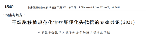 2014 年,中華醫(yī)學(xué)會(huì)醫(yī)學(xué)工程學(xué)分會(huì)干細(xì)胞工程學(xué)組發(fā)布了我國(guó)第一個(gè)干細(xì)胞移植規(guī)范化治療失代償期肝硬化的專家共識(shí),2021年發(fā)布該共識(shí)的第二版。
