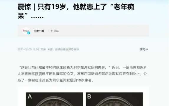 國際知名學術刊物《阿爾茲海默癥期刊》上曾刊登過一篇論文,公布了一例被臨床診斷為阿爾茲海默癥的19歲患者。刷新大眾對于該病認知的同時,也讓“癡呆癥”、“認知障礙”等再一次被大眾所熱議和關注。