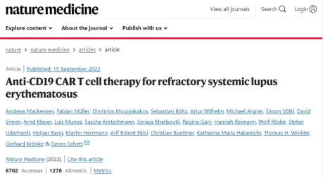 另外一項(xiàng)德國(guó)研究團(tuán)隊(duì)關(guān)于CAR-T細(xì)胞療法治療系統(tǒng)性紅斑狼瘡(SLE)研究成果,在nature medicine雜志上進(jìn)行了發(fā)表:5名SLE患者在接受靶向CD19的CAR-T細(xì)胞療法后,實(shí)現(xiàn)無(wú)治療緩解長(zhǎng)達(dá)17個(gè)月。