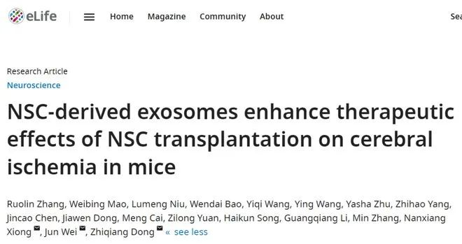 2023年4月27日,國內一科研團隊在國際著名學術期刊eLife上發表了題為:NSC-derived exosomes enhance therapeutic effects of NSC transplantation on cerebral ischemia in mice 的研究論文。