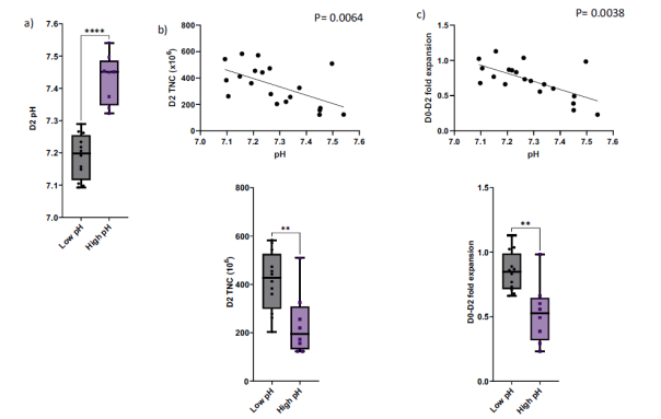 Michaela等人檢測了抗CD22 CAR - T細胞培養物的pH和代謝參數,并探討了培養條件與臨床結果之間的關系。納入研究的產品來自20名被診斷為復發性或難治性表達CD22的B細胞惡性腫瘤的兒童和年輕人,并參加了抗CD22 CAR - T細胞(NCT 02315612)的1/2期臨床試驗。在細胞培養至第二天時將產品分為低PH組(12個樣品 ,PH范圍從7.093-7.289;平均值7.2))和高PH組:(8個樣品,pH范圍為7.323 ~ 7.541;平均值7.4)。Michaela等人的研究顯示,CAR - T細胞制備過程中的pH波動與細胞產物的性質相關,并可能指示臨床結果。