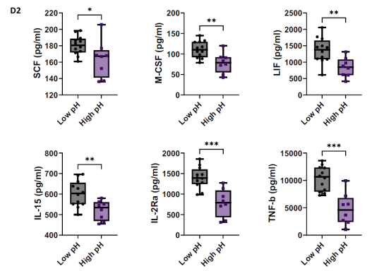 生產開始時的高pH值與有核細胞數量減少、細胞擴增減慢和T細胞代謝重編程有關(圖2)。在低和高pH組之間比較了細胞因子和生長因子的水平,與高pH組相比,低pH組的樣品中有6種分析物的含量明顯更高(圖3),低pH組的樣品中干細胞因子(SCF, p < 0.04)、巨噬細胞集落刺激因子(M-CSF, p < 0.004)、白血病抑制因子(LIF, p < 0.0052)、白細胞介素15 (IL-15, p < 0.0066)、白細胞介素受體2 α (IL2Rα, p < 0.0002)和腫瘤壞死因子β (TNF-β, p < 0.0001)的水平升高,表明更活躍的T細胞將分泌更多的細胞因子和生長因子到細胞培養基中。從較低pH開始的細胞增加了幾種細胞因子的產生,包括IL-6、IL12p70、TNF-a和GM-CSF,這些細胞因子不僅在CAR -T細胞的靶向細胞毒性中發揮重要作用,而且在脫靶效應的發展中發揮重要作用,如CRS和神經毒性。