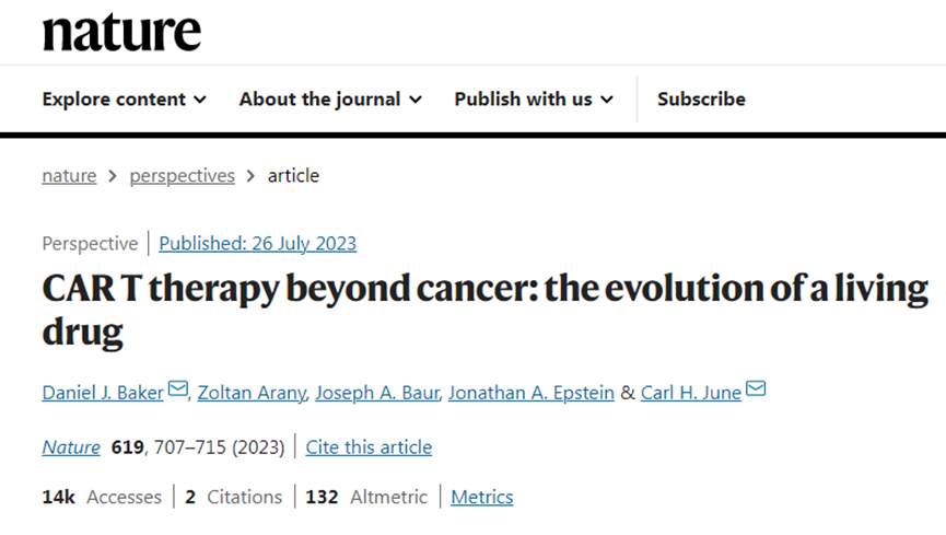 近期,Nature雜志及其子刊相繼發文,闡述了CAR-T免疫細胞治療的前景。其中一篇發文表示,來自臨床和臨床前研究的證據強調了CAR - T療法在腫瘤以外的應用潛力,比如在治療自身免疫、慢性感染、心臟纖維化、衰老相關疾病和其他疾病方面的潛力。