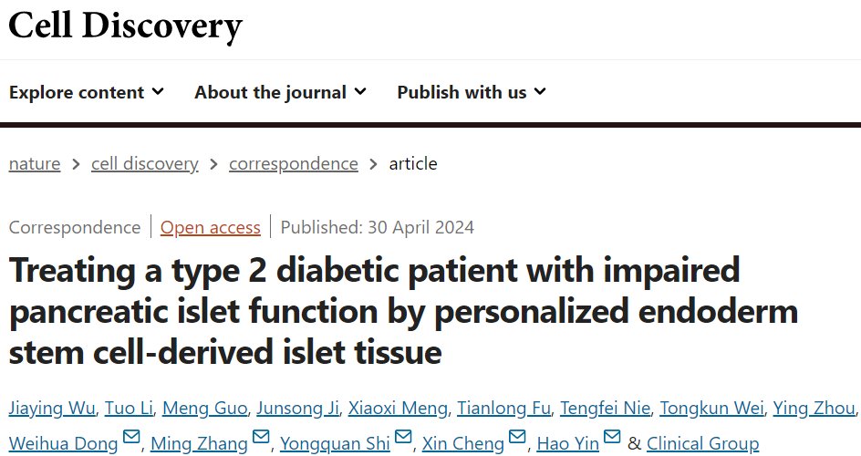 近日,國際學術期刊《細胞發現》(Cell Discovery)在線發表了題為“Treating a type 2 diabetic patient with impaired pancreatic islet function by personalized endoderm stem cell-derived islet tissue”的研究成果。“國內干細胞治愈嚴重2型糖尿病患者,并停用胰島素33個月”這是我國干細胞與再生醫學領域的重大突破,是國際上首次利用干細胞技術成功再生人類胰島組織,也為我們揭示了干細胞在再生醫學中的巨大潛力。