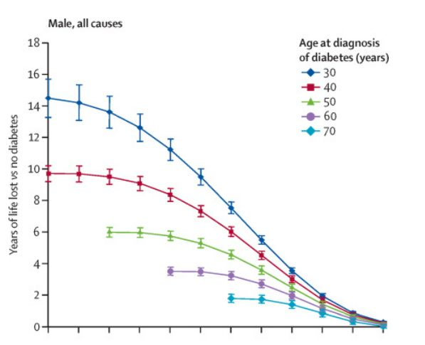 一個人越早被診斷出患有 2 型糖尿病,其預期壽命縮短的幅度就越大。總體而言,糖尿病診斷時間每提前十年,其預期壽命就會縮短約四年。這項研究提出了一個很現實的問題,那就是糖尿病發病年齡越早,預期壽命越低。