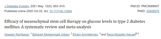 2021年5月,伊朗德黑蘭醫科大學研究團隊在權威醫學期刊《Journal of Diabetes Investigation》上發表了一篇題為《Efficacy of mesenchymal stem celltherapy on glucose levels in type 2 diabetes mellitus: A systematic reviewand meta-analysis》(間充質干細胞治療對二型糖尿病糖尿病患者血糖水平的療效:一項系統綜述和薈萃分析)的綜述報告。